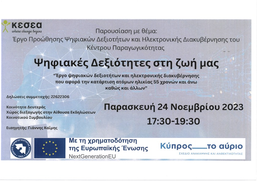 Παρουσίαση με θέμα “Έργο Προώθησης Ψηφιακών Δεξιοτήτων και Ηλεκτρονικής Διακυβέρνησης του Κέντρου Παραγωγικότητας”