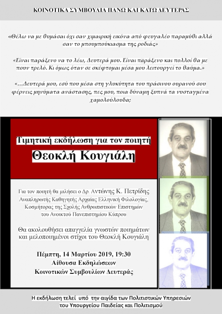 Τον ποιητή Θεοκλή Κουγιάλη θα τιμήσουν με απαγγελία ποιημάτων του οι ποιητές: Κώστας Βασιλείου, Ευφροσύνη Μαντά -Λαζάρου, Αντρέας Στυλιανού, Θεόκλητος Πολυνείκης, Βάκης Λοϊζίδης, Ευρυδίκη Περικλέους – Παπαδοπούλου, Κώστας Πατίνιος. Η εκδήλωση περιλαμβάνει ερμηνεία μελοποιημένων ποιημάτων του Θεοκλή Κουγιάλη. Σύνθεση Αγγελικής Πρέζα, Γιούρι Στούπελ. Στο πιάνο η Αγγελική Πρέζα. Τραγουδά η Γεωργία Πολυνείκη.